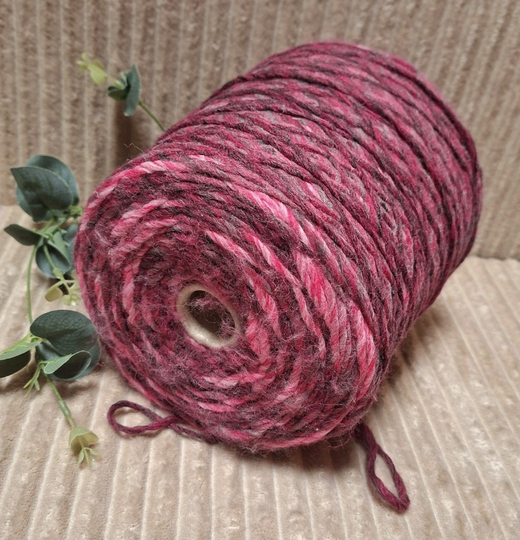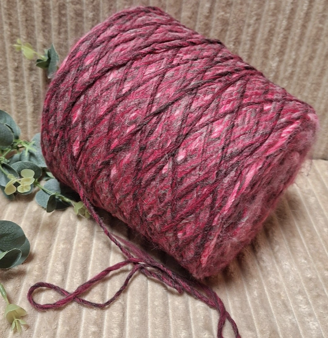Storas, minkštas fancy tipo vilnos mišinio siūlas su melanžiniu fuksijos spalvos efektu.